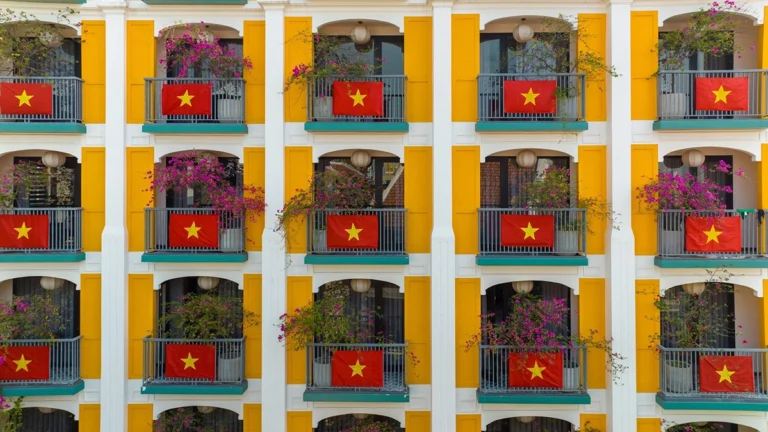 Khách sạn chuyên khách nước ngoài ở Hội An treo 80 lá cờ Tổ quốc ở các ban công chào mừng dịp lễ 30/4-1/5 khiến du khách bất ngờ, thích thú.