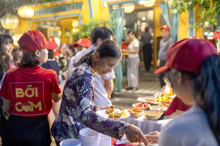 Bữa tiệc buffet đặc biệt được một nhà hàng ở Hội An tổ chức. 1.000 phiếu mời đã được phát ra, nhiều gia đình nghèo dẫn theo con cái, cha mẹ đi ăn thỏa thích.