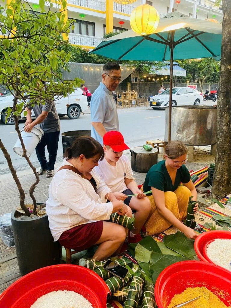 VHO - Đến tham quan phố cổ Hội An vào những ngày giáp Tết Nguyên đán Ất Tỵ 2025, nhiều du khách quốc tế đã có kỷ niệm bất ngờ khó quên khi tham gia hoạt động gói và nấu bánh tét, bánh